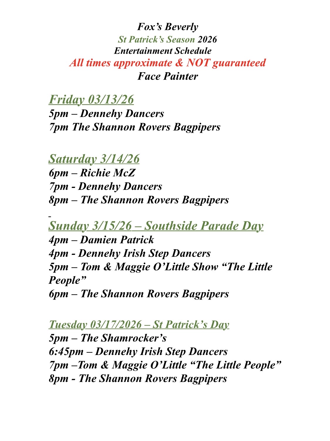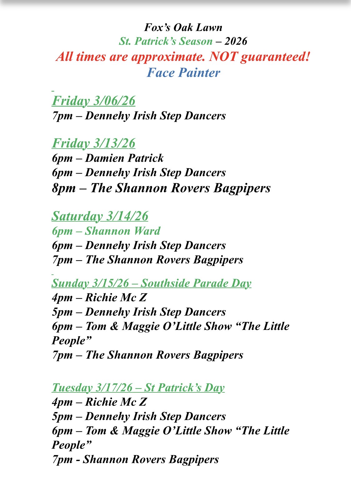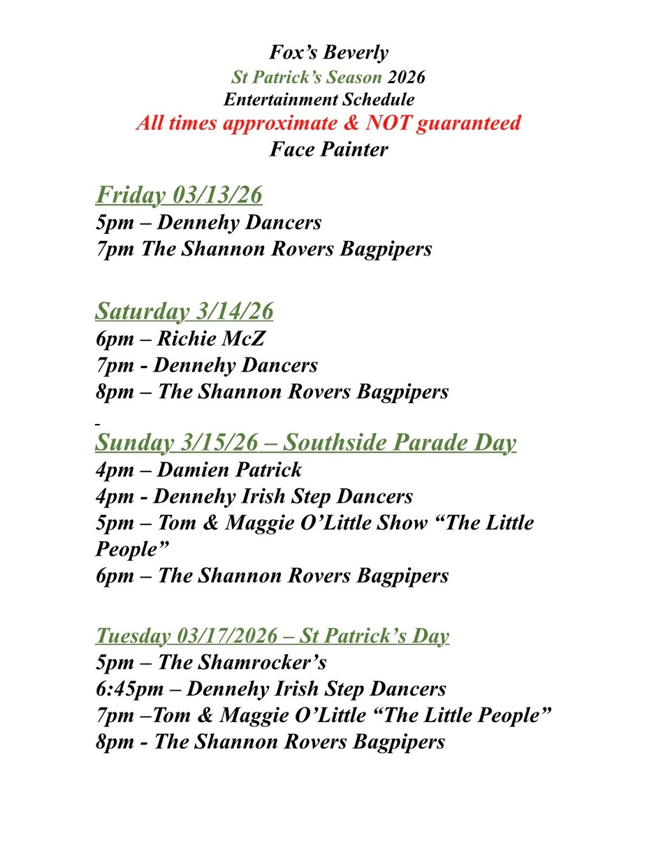 Fox's Oak Lawn: 3/7 Coco & Fancy, 3/14 Shannon Ward, 3/21 Billy Gray, 3/28 Evin O'Riordan