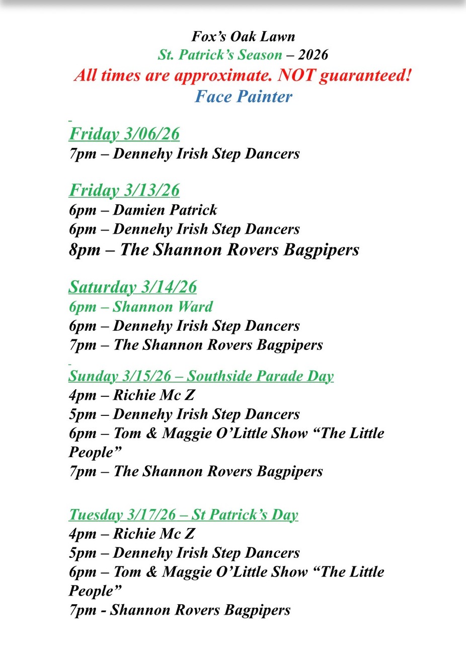 Fox's Oak Lawn: 1/3 Richie Z, FRIDAY - 1/9 Dan McGuinness, 1/10 Billy Grey, 1/17 Brian, 1/24 Shannon Ward, 1/31 Fast Eddie